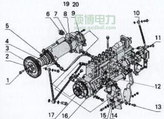 1提前器部件 2喷油泵齿轮 3喷油泵螺固螺栓 4连接板 5增压补偿管 6机油管 7螺栓 8螺栓