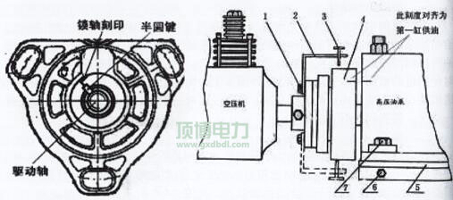 转动曲轴,使调测螺钉处于上下方位置时测量与提前器之间的间隙差值控制在0.4mm范围内。 图2-9-4 空压机与油泵同轴度检查 1联接螺栓 2检测架3调测螺钉 4提前器 5油泵托架 6托架螺钉 7油泵紧同螺栓